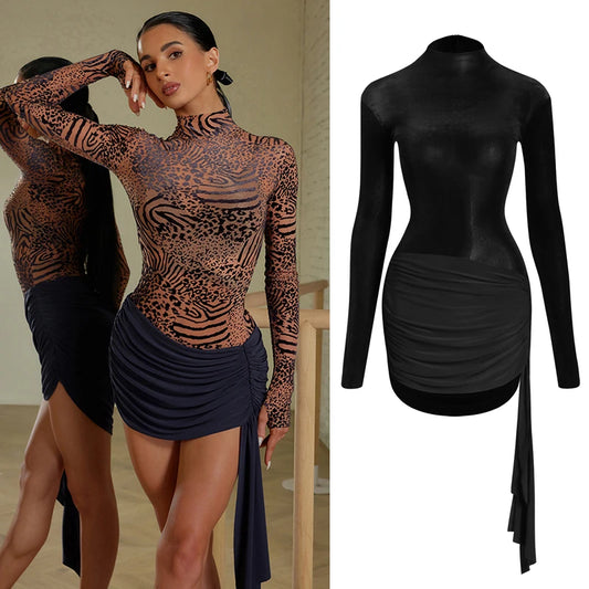 New See-Through Mesh Latin Dance Tops Women Long Sleeves Black Leopard Bodysuit Adult Practice Wear Rumba Dance Clothes DNV18538
