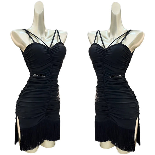 Summer Latin Dance Dress Women Sexy Drawstring Black Fringer Dress Adult Rumba Dance Clothes Club Salsa Practice Dress DNV18404