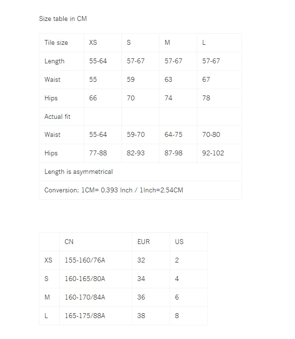 Size table in CM
