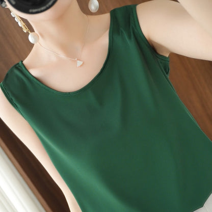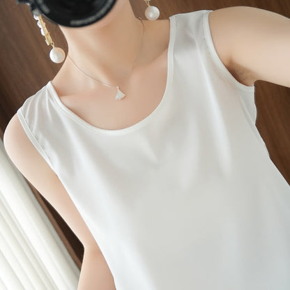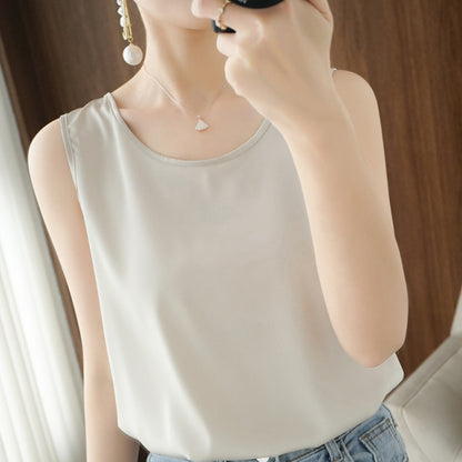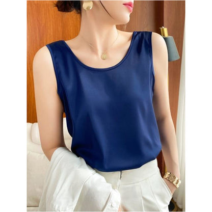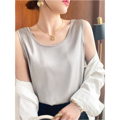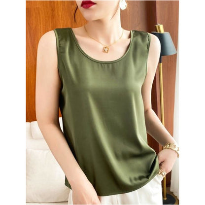 Summer Shiny O Neck Women Satin Silk Harajuku T Shirt Sleeveless Fashion Real Silk Woman Tops Casual Female Luxury Sexy